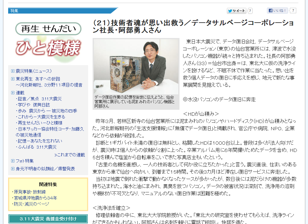 河北新報にてデータサルベージ並びに当社代表が紹介されました