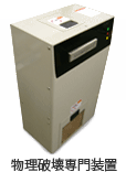 当社オリジナル物理破壊専門装置(写真右)により、各メディアともデータ記録面が読み取り不可なサイズに粉砕するため、粉砕後メディアから、データ復旧を行なう事は不可能となります。