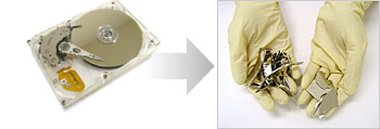 物理的に粉砕されたプラッタからは、二度とデータを抽出する事が出来なくなり確実にデータを消去します。