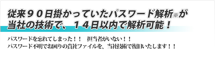 人事異動や退職等、前任者が残したデータ(Excel、Word、Access、PowerPoint、ZIP等)が、 パスワードが不明となり、開くことができない時、残された担当者や総務・管理部門の方にとって、 いつも悩みの種となる出来事です。また、担当者自身が煩雑なパスワード設定のため、パスワード自体を忘れているというケースも後を絶ちません。事異動のシーズンはただでさえ業務の忙しい季節と重なり、開くことができないファイルの解決に費やす時間の無駄は多忙な中でつらいもの(パスワード解析のフリーソフトや市販のパスワード解析ソフトを用いても、100日近い膨大な作業時間がかかります)。とはいえ、最初からデータを作り上げることは時間が許しません。